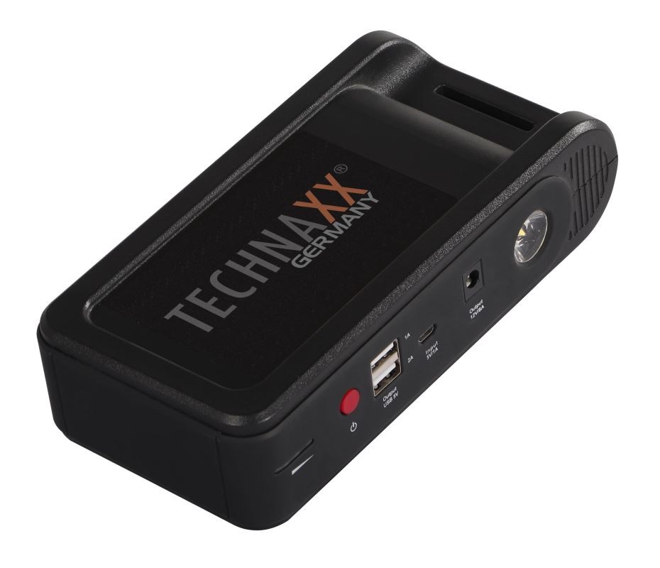 Technaxx Jump Starter, Powerbanka 3-v-1, 10000mAh - pro nouzové nastartování auta, nabíjení (např. Chytrého telefonu/Tabletu/PC/atd.) a nouzové světlo.• Jump starter s 10000mAh lithium-zelezo-fosfatovou baterií