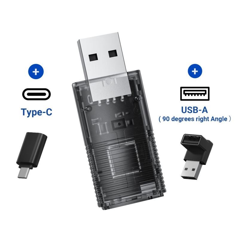 Díky přibaleným USB adaptérům (Type-A na C a 90° Type-A na A) je možné zařízení flexibilně použít v různých typech vozidel.