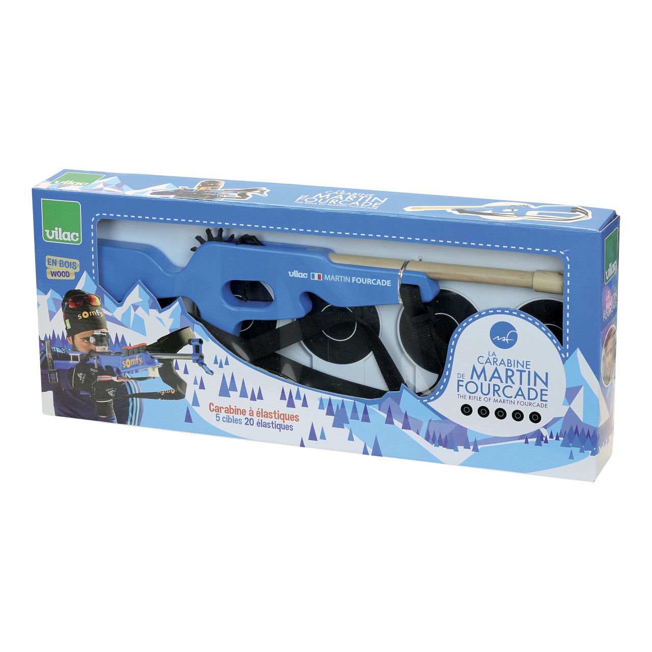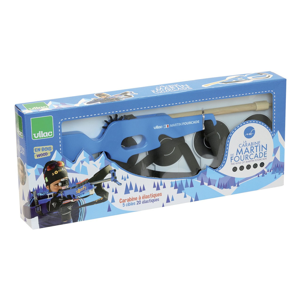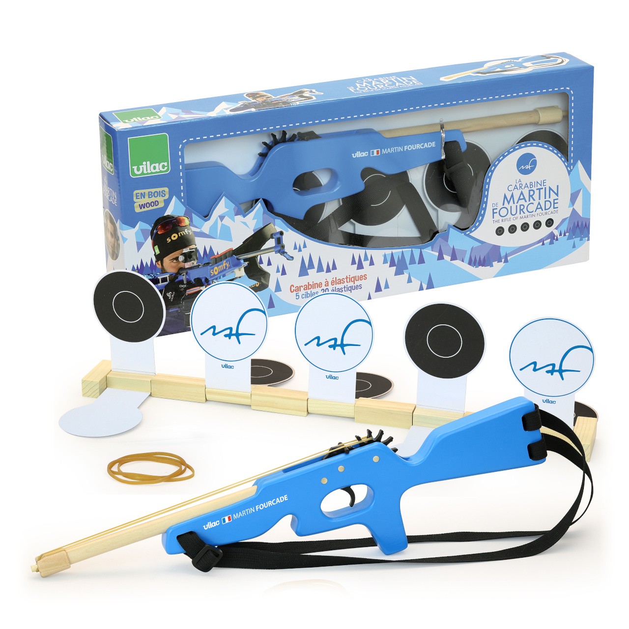 Máte doma malé sportovní nadšence, kteří se nezaleknou ani zimy?  Tato hračka je přesně pro ně! Děti se při svých hrách většinou inspirují pohádkami, knížkami nebo televizními programy. Hrají u vás doma v zimním období hlavně sportovní programy? Pak je možné, že máte doma malé biatlonové nadšence. Češi fandí kromě hokeje a lyžování hlavně biatlonu. Představíme vám dnes dřevěnou hračku, která potěší mladé sportovní nadšence. Biatlonová malorážka francouzského sportovce Martina Fourcada. Fourcade je pětinásobný olympijský vítěz a držitel jedenácti zlatých medailí z MS. Pokud sledujete biatlon pravidelně jistě víte, jak je Martin pro svou disciplínu nadšený. Miluje nejen svůj sport, ale i své fanoušky a podporovatele. Je tedy přirozené, že chtěl něco udělat i pro ně – pro vás. Chtěl, aby i ti nejmenší měli možnost naučit se něco o biatlonu a hrát si na sportovce soutěžícího na mistrovství světa či olympiádě. Martin Fourcade se narodil a vyrostl ve Francii, možná i proto se rozhodl oslovit francouzskou firmu Vilac, která se zabývá návrhem a výrobou hraček. V zasněženém pohoří Jura spolu vymysleli projekt, který později nadchnul mnoho dětí a rodičů. Vyrobili Martinovu biatlonovou malorážku. Jako všechny hračky firmy Vilac je i tato malorážka vyrobena s ohledem na životní prostředí.  Hračka je vyrobena ze dřeva a má nastavitelné textilní popruhy. Pažba malorážky je modrá, pod hlavní je umístěna vlajka Francie a jména autorů projektu – Martin Fourcade, Vilac. V balení najdete pět sklopných terčů a dvacet gumiček. Nastavte popruhy tak, aby vyhovovaly vašemu synovi, dceři nebo vám samotným. Postavte terče na požadovanou vzdálenost a dejte je do správné polohy. Ukažte dětem, jak správně a bezpečně gumičku natáhnout na dřevěnou malorážku. Teď už stačí jen zamířit a stisknout spoušť! Schválně, na kolik pokusů trefíte všech pět terčů?  Hlavní vlastnosti: nastavitelné textilní popruhy v balení pět sklopných terčů a dvacet gumiček