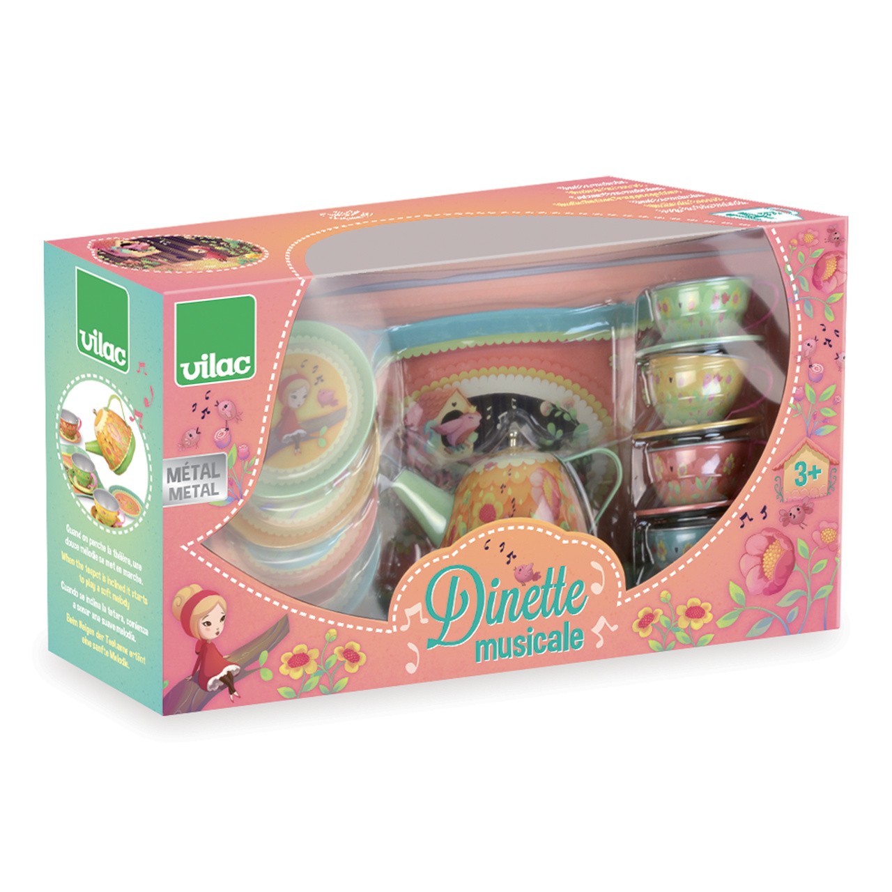 Kovový set nádobí s krásnou pohádkovou ilustrací „magického lesu“, s podtáckem. Tento set je speciální v tom, že při servírování hraje hudbu. V balení najdete 14 ks vybavení: velký tác pro lehký přesun nádobí, 4 hrnečky s podtácky, 4 dezertní talířky a konvičku, která při náklonu začne hrát pěknou melodii. Velikost tak akorát pro dětské ruce. Vyrobeno ve Francii. Hlavní vlastnosti: obsahuje 14 kskovové nádobíkonvice v sobě ukrývá natahovací hrací strojekvyrobeno ve Francii