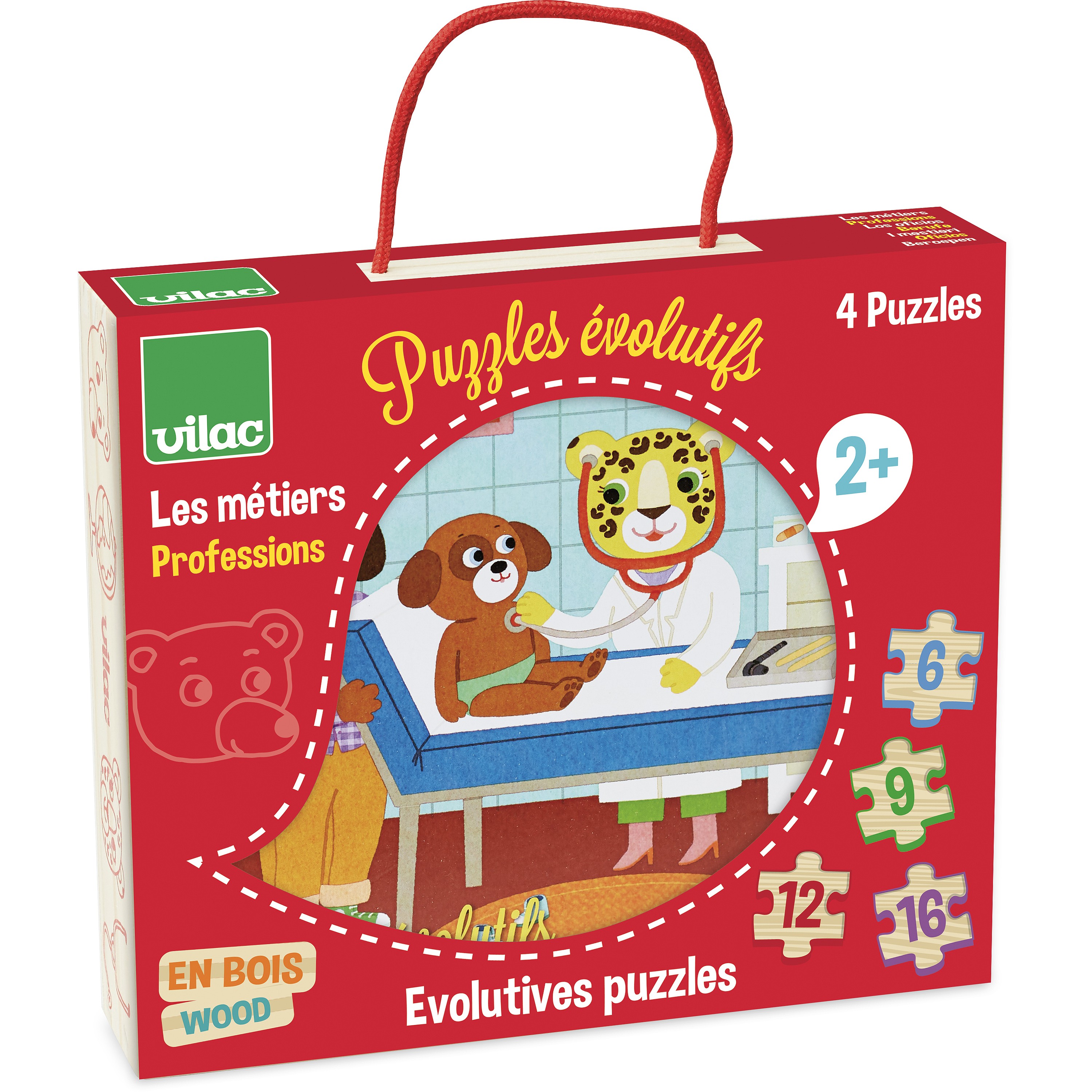 Sada čtyř vývojových puzzlí s tematikou povolání. Puzzle mají zvyšující se obtížnost – 6, 9, 12 a 16 dílků. Zabaleno v boxu s bavlněnou rukojetí. Hlavní vlastnosti: 4 puzzle po 6, 9, 12 a 16 dílcích praktický úložný box