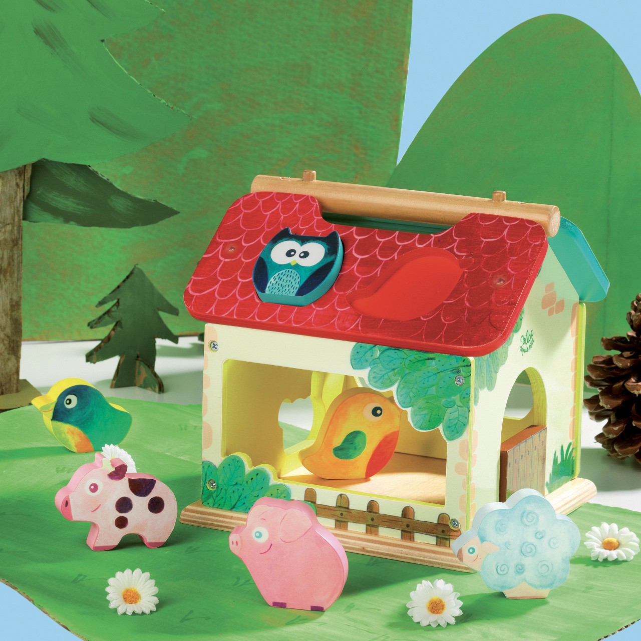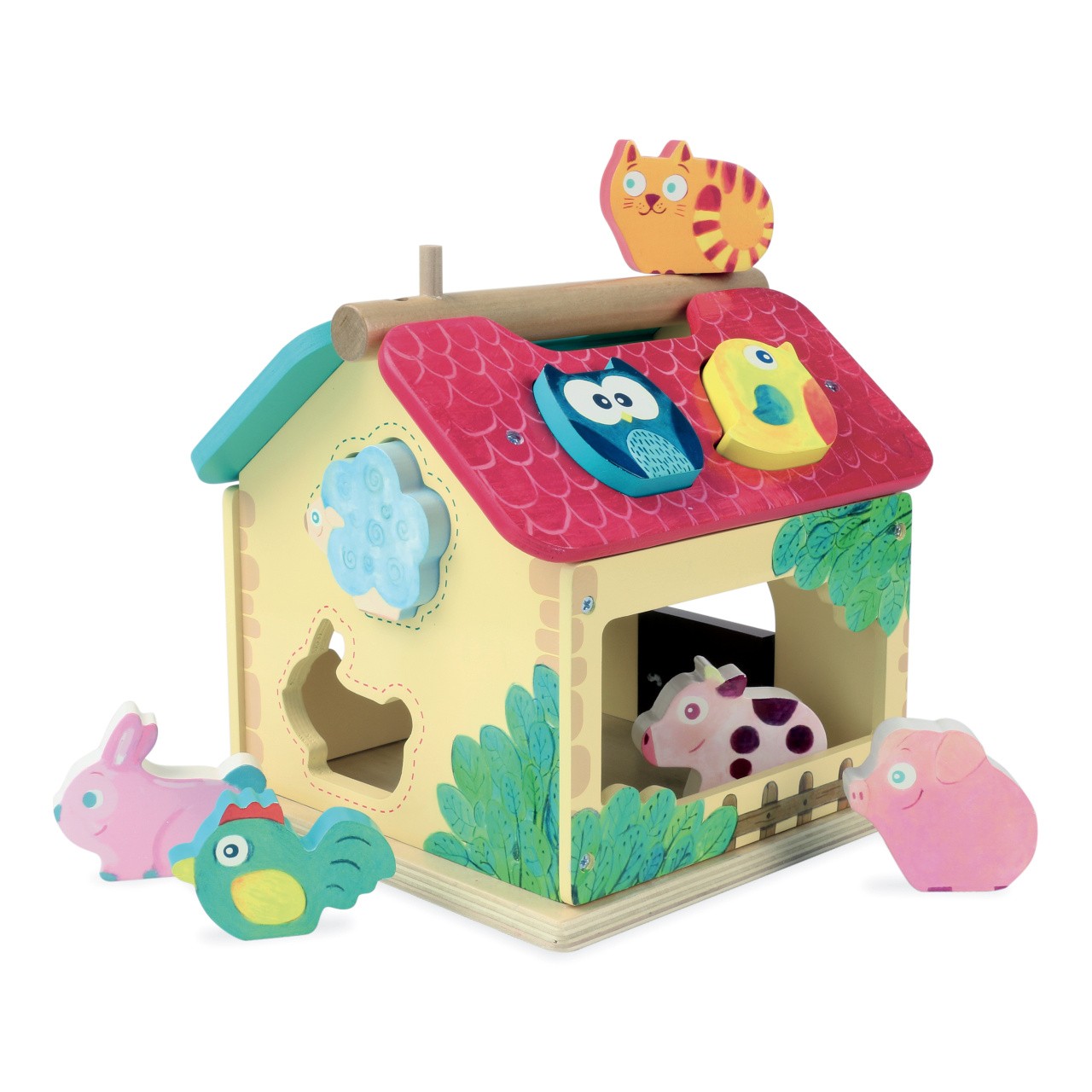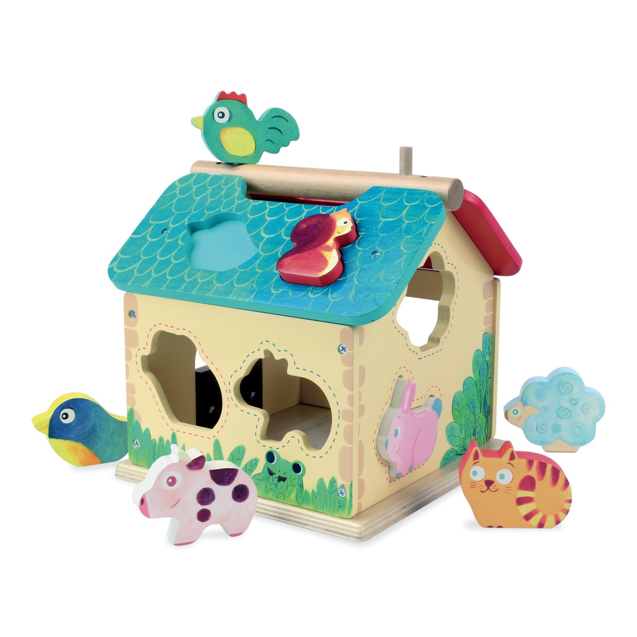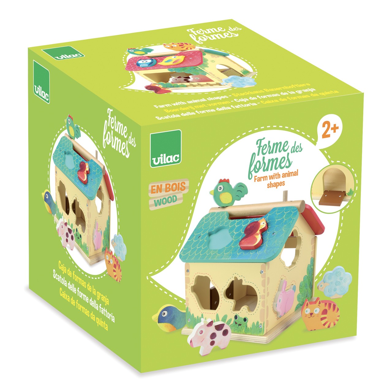 Dřevěná barevná farma s vkládacími otvory pro každé ze zvířátek. Děti se při hře učí poznávat tvary, barvy a zvířata, trénují si jemnou motoriku. Obsahuje deset dřevěných zvířátek.  Hlavní vlastnosti: obsahuje 1 domeček a 10 zvířátektrénuje jemnou motoriku dětí