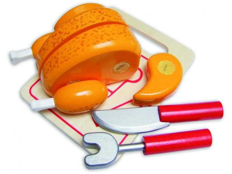 Skvělý doplněk do dětských kuchyněk. Upečte kuře a pak jej nakrájejte. Hlavní vlastnosti: dřevěné dílky jsou spojeny suchým zipemvčetně prkénka a kuchyňského nářadí