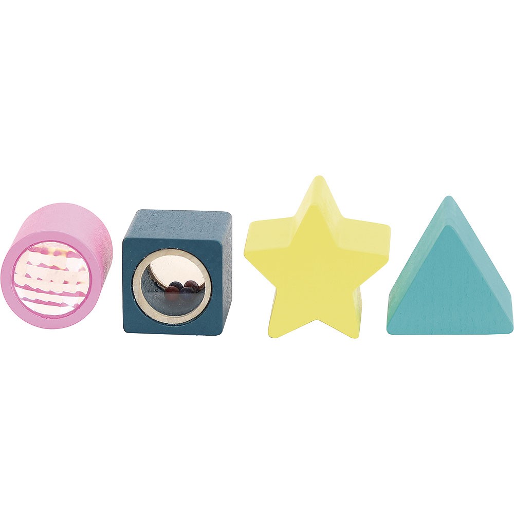Vkládací dřevěná kostka s 4 různými tvary. Kaleidoskopický válec, zvuková kostka, hvězdička a trojúhelník pomohou rozvíjet jemnou motoriku, senzorické funkce a poznávání barev při vkládání do příslušných otvorů motorické kostky. Z jedné strany má kostka pružné šňůrky s korálky. Hlavní vlastnosti: moderní originální designnové herní prvky v podobě senzorických kostek a pružných šňůrekrozvíjí motoriku, senzorické funkce a poznávání barev