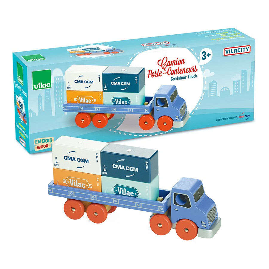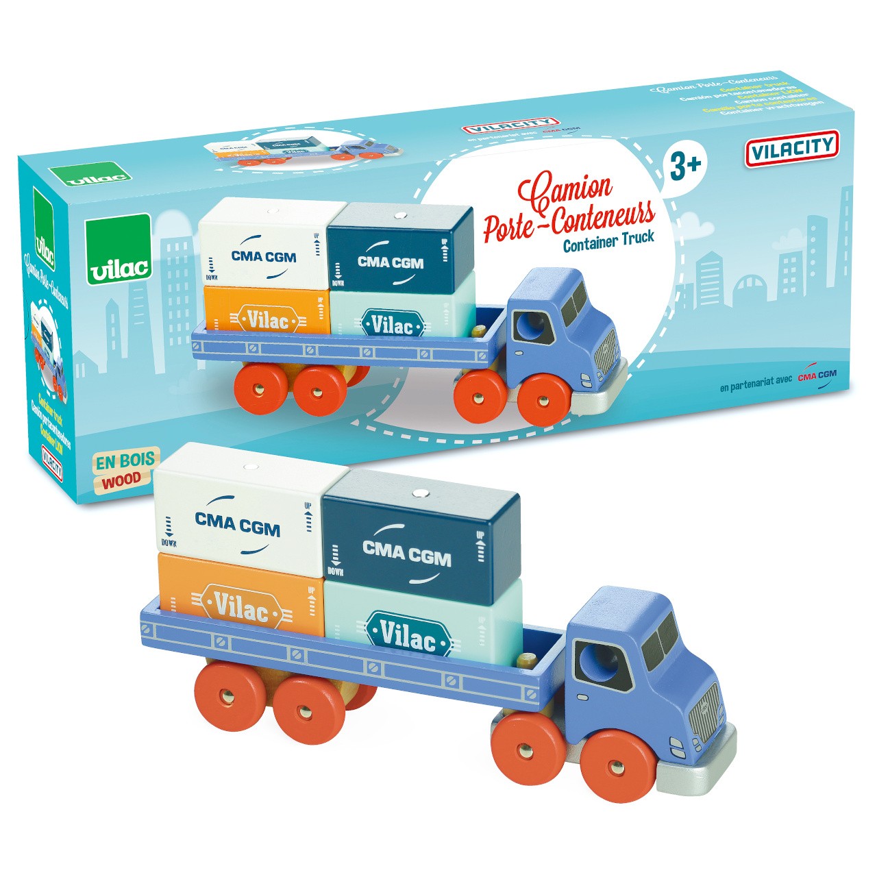 Dřevěný tahač s přívěsem a magneticky spojenými kontejnery, vyrobený ve spolupráci s čelní fracouzskou přepravní společnosti CMA CGM. Je součástí Vilacity kolekce a je se všemi jejími součástmi plně kompatibilní, další samostatná rozšíření přinesou variabilitu a prohloubí zážitek ze hry. Hlavní vlastnosti:tahač, přívěs a 4 kontejnerymagnetická spojeníkompatibilní se všemi součástmi Vilac Vilacity kolekcevyrobeno ekologicky, šetrně k prostředí V2357 – Přístavní jeřáb Vilacity (není součástí sady, najdete v naší nabídce): V2356 – Nákladní loď Vilacity (není součástí sady, najdete v naší nabídce): V2356S – Nákladní loď Jacques Saadé Vilacity (není součástí sady, najdete v naší nabídce): Příklad sestavy nákladního auta s dalšími součástmi kolekce Vilacity: