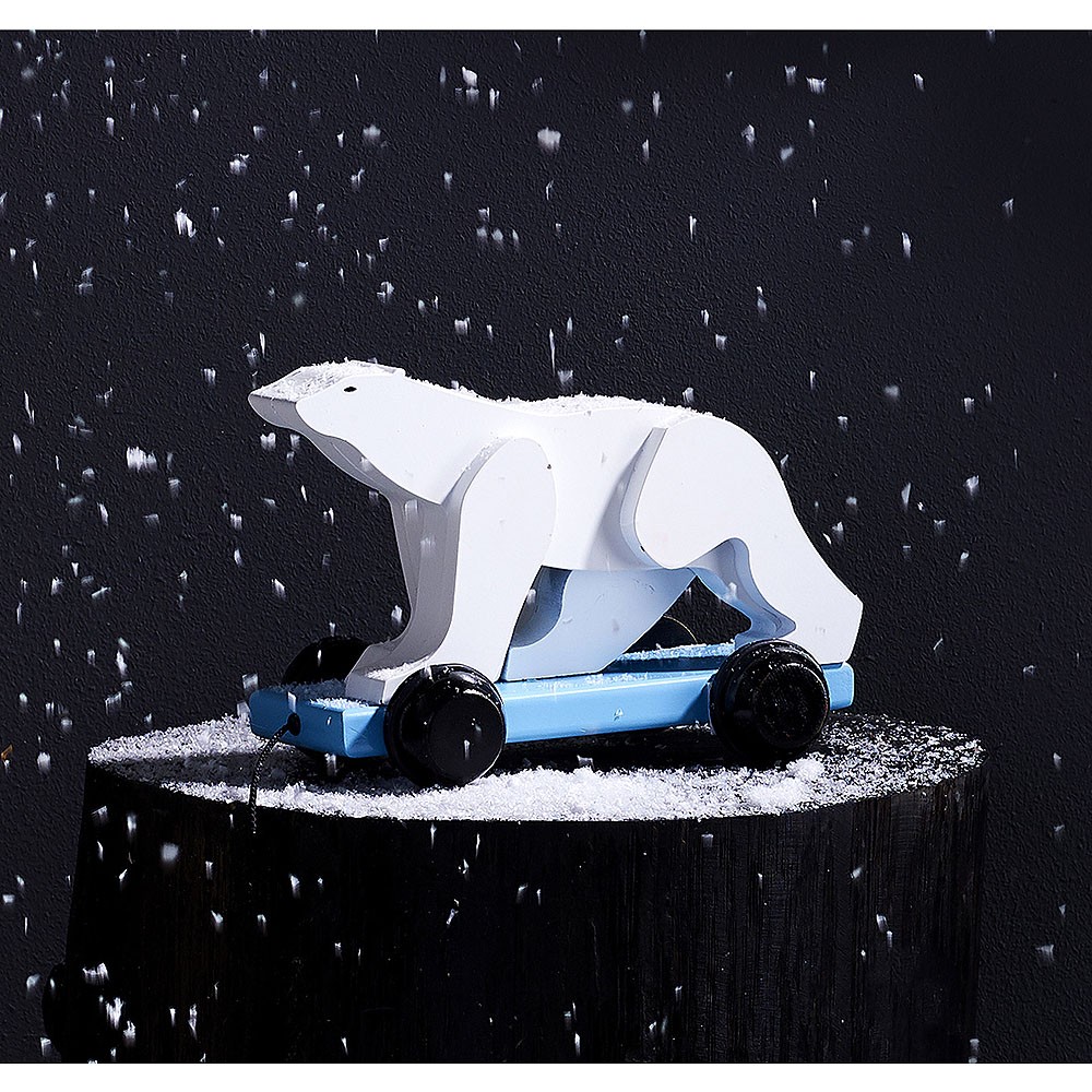 Dřevěný tahací lední mědvěd v designu Francoise Pompona.  Hlavní vlastnosti: design Francois Pomponrozvíjí koordinaci pohybů dětí   Se svým malým přenosným pracovním stolem se sochař François Pompon (1855–1933) rád procházel po pařížském Jardin des Plantes (veřejný park a botanická zahrada). Tam mohl pozorovat zvířata a vyrábět jejich modely v malém měřítku. Zpět ve svém ateliéru vyřezával medvědy, pantery, ale také psy, kuřata a králíky, zjednodušováním tvarů nacházel podstatu každého zvířete. Před očima návštěvníků Muzea Orsay, kde je uloženo velké množství těchto soch, tak zvířata ožívají! Jeho sochy reinterpretoval umělec Gérard Lo Monaco a ve spolupráci s RMN (sdružení 34 muzeí) a Muzeem Orsay vzdává poctu Pomponovi výrobou této nádherné řady dřevěných hraček.
