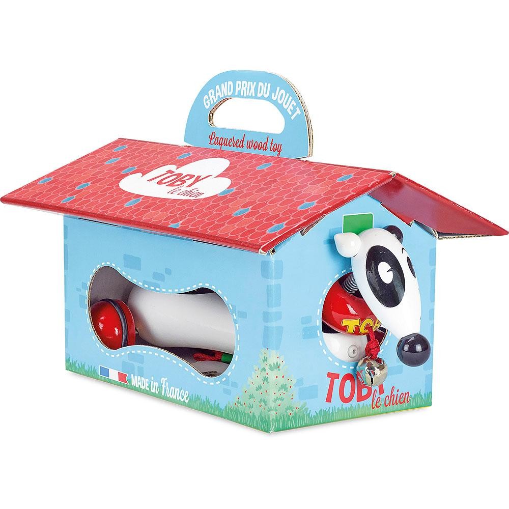 Toby je vyrobený z masivního vysoce odolného lakovaného dřeva. Jeho hlava a ocas jsou na pružinách. Na krku má rolničku. Kola jsou opatřena gumovým proužkem pro tichý chod na pevných podlahách. Dodává se v krabici ve tvaru psí boudy. Vyrobeno ve Francii.  Hlavní vlastnosti: podporuje rovnováhu a koordinaci pohybůvyrobeno ve Francii