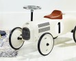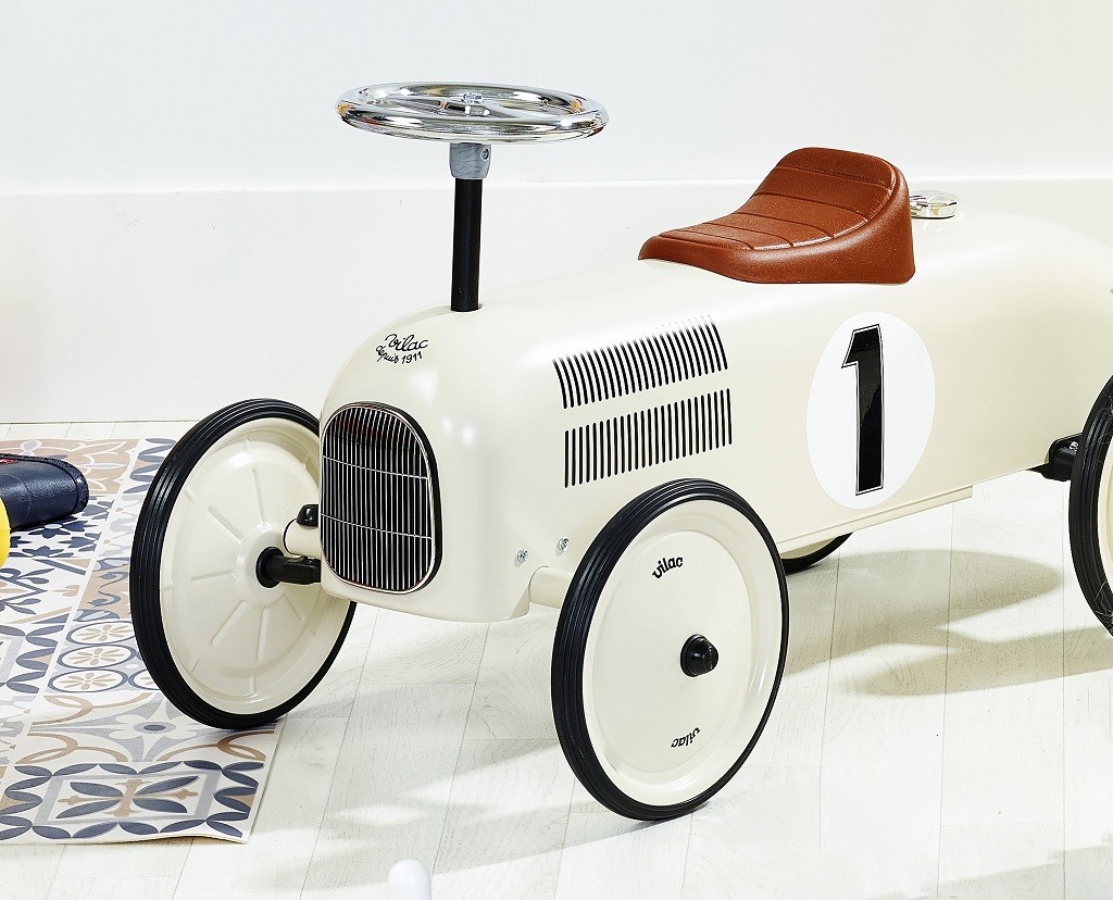 Odrážedlo Vintage ve stylu závodního auta je plně kovové a má krémovou metalickou barvu. Volant ovládá zatáčení předních kol. Hnědé sedadlo je vyrobeno z plastu. Kola odrážedla jsou pogumovaná a zaručují tak tichý chod i na pevném povrchu.  Hlavní vlastnosti: stabilní kovové odrážedlo s pogumovanými kolystylový originální designnosnost 20 kg