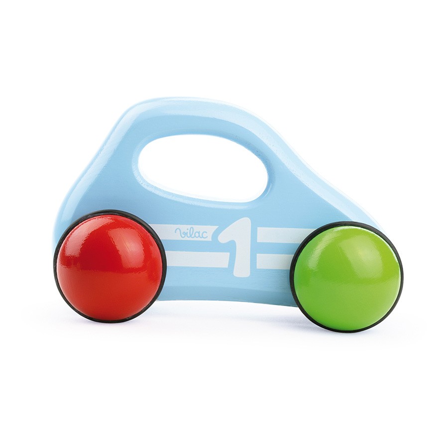 Modré závodní auto speciálního dizajnu, vyrobeno z lakovaného dřeva s čtyřbarevnými pogumovanými koly. Je vhodné jak ke hraní tak jako dekorace do pokojů dětí či dospělých. Vyrobeno ve Francii.  Hlavní vlastnosti: vyrobeno ve Francii