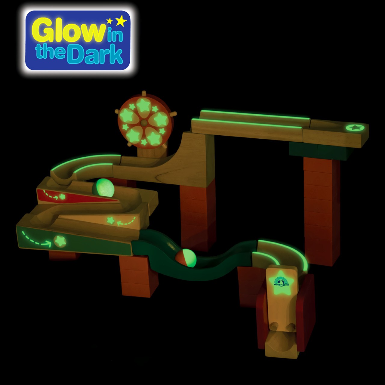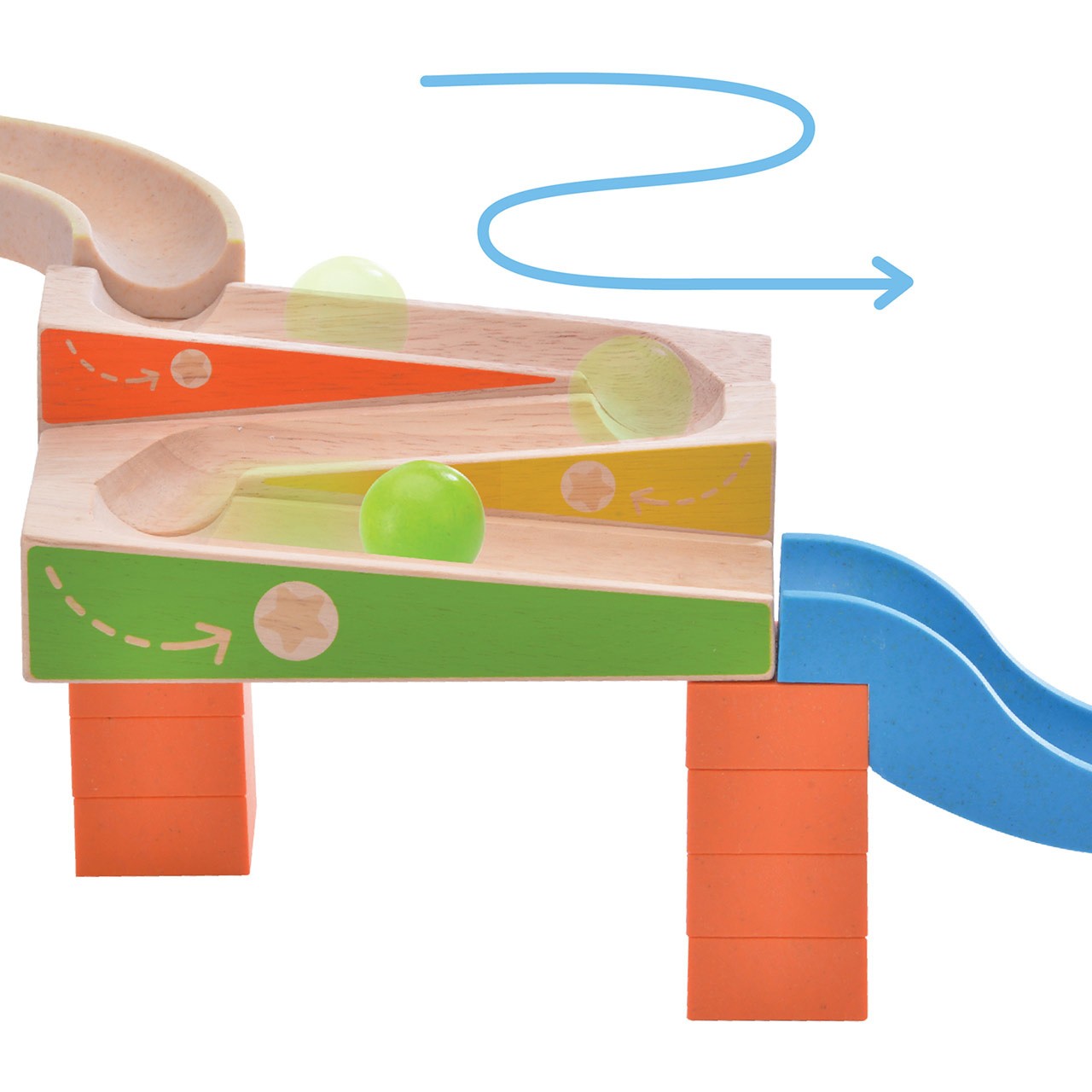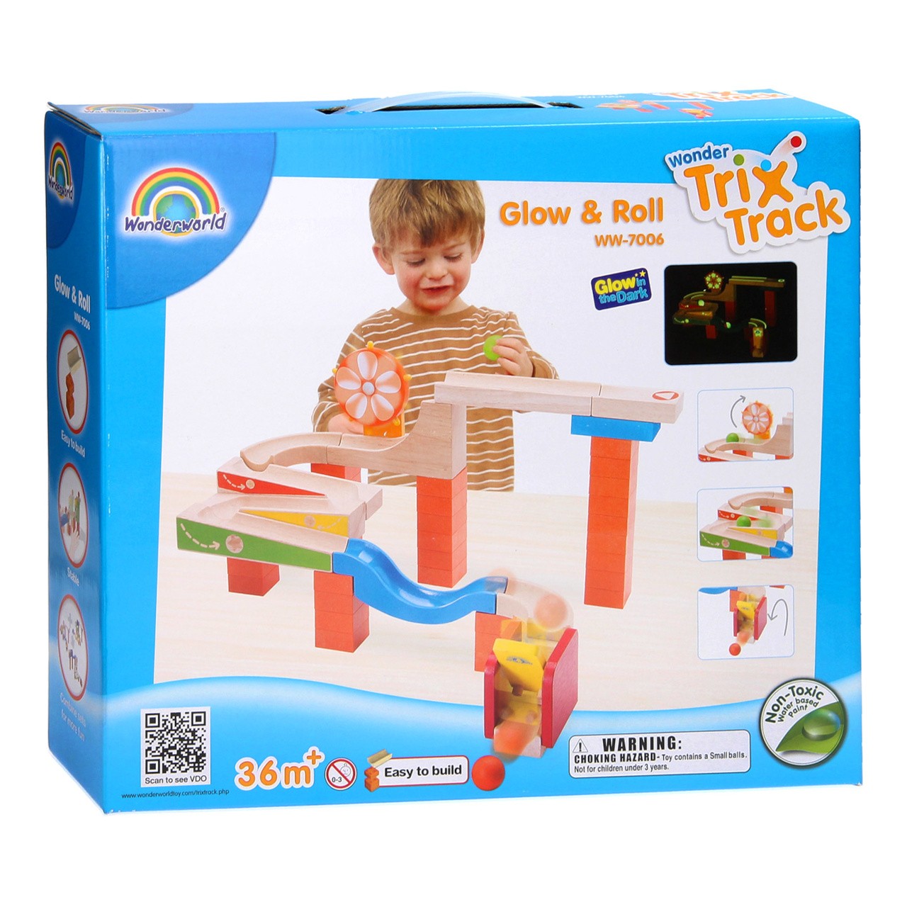 Ukázka kuličkové dráhy Wonderworld TRIX® Svítící kolo.   S kuličkovými dráhami ze série TRIX® od firmy Wonderworld si užijete spoustu skvělé zábavy. Díky své variabialitě, nápaditosti a propracovanému konceptu celé série TRIX® se jedná o velmi hodnotnou hračku, kterou ocení jak děti, tak dospělí hráči. Všechny kuličkové dráhy ze série TRIX® lze vzájemně kombinovat, a stále tak zvedat laťku kombinací a zábavy. Svou ohromnou variabilitou rozvíjí dětskou představivost, možnosti sestavení jsou téměř nekonečné. Sestavená dráha je vždy stabilní díky promyšlenému a jednoduchému systému spojování dílů. Základní stavební díly jsou vyrobeny z dřevoplastu, vlastní dráha pak převážně z masivního dřeva. Součásti nabízí kvalitní hladkou povrchovou úpravu a kombinaci atraktivních sytých barev s barvou přírodního dřeva. Stavebnice je spolu s obrázkovým návodem k sestavení dodávána v pestře potištěné kartonové krabici vybavené praktickým plastovým uchem k přenášení. Dráhy lze doplnit také drobným příslušenstvím, základními kostkami a ozdobnými kuličkami, které naleznete v naší nabídce.   Hlavní vlastnosti:44 dílů celkem, 2 nápadité překážkysystém spojení zaručující stabilituodolné provedenívytříbená barevnost a povrchová úpravalze kombinovat s dalšími dráhami ze sortimentu výrobce   Ukázka možné kombinace kuličkových dráh Wonderworld TRIX®.   Ukázky možných kombinací dráhy Svítící kolo s dalšími dráhami Wonderworld TRIX®:
