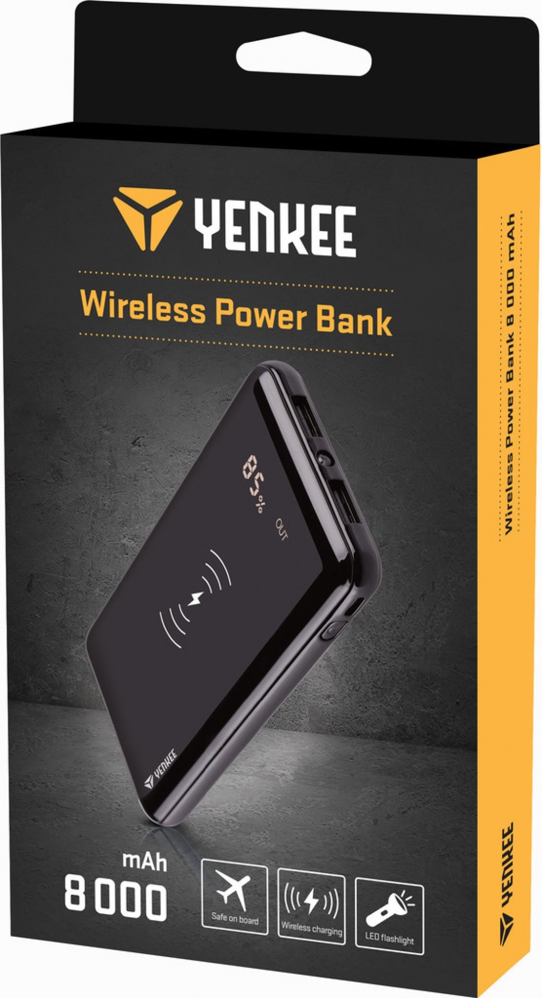 Bezdrátová powerbanka disponuje kapacitou 8 000 mAh a kompatibilní chytré telefony dobíjí pomocí technologie Qi. Yenkee YPB 0820 Wireless Power bank 8000 je vybavená 2× USB konektorem a nabíjí výkonem až 5 W. Funguje i jako LED svítilna. Díky šestinásobné ochraně je použitelná i v letadle Celý popis