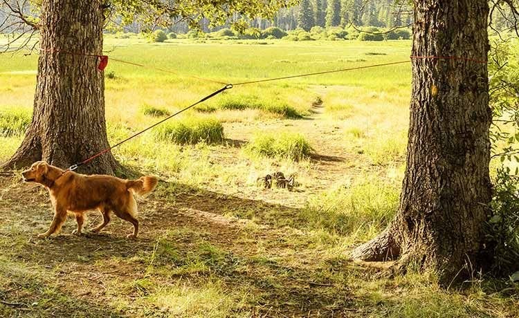 Systém zavěšení umožňující psům pohybovat se v táboře, přičemž zůstávají bezpečně na vodítku