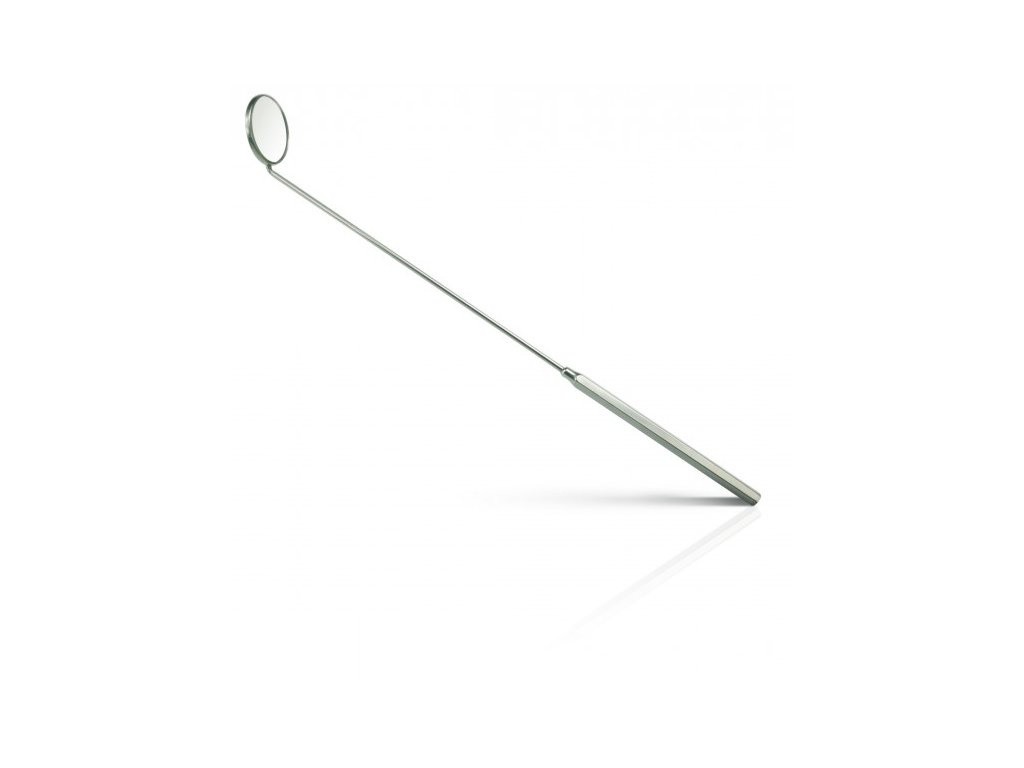 Zrcátko na vyšetření hrtanu s nerezovou rukojetí.